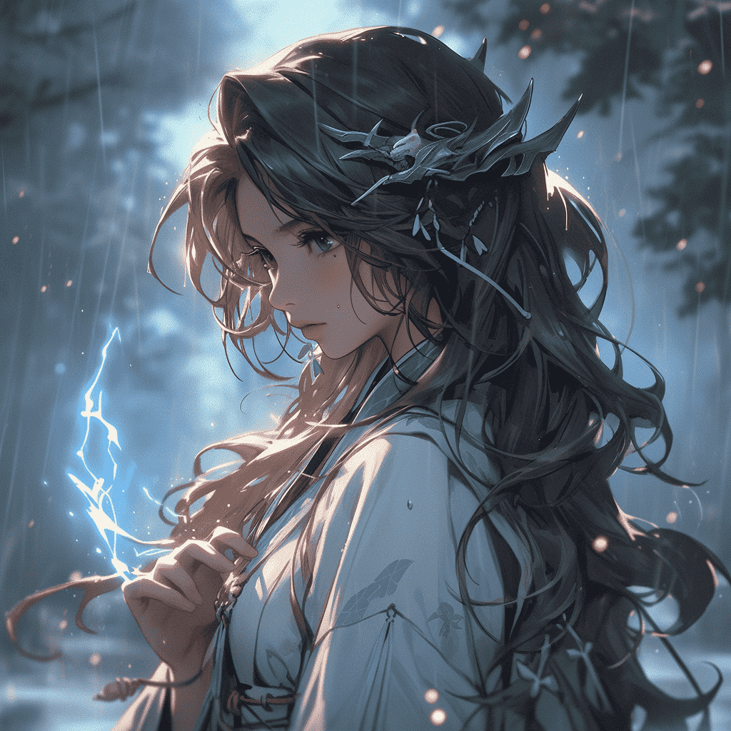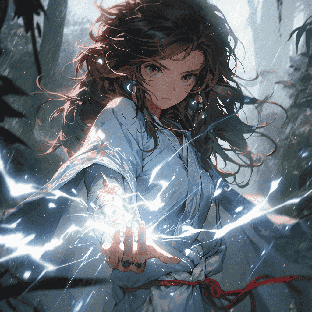 EN:Martial arts screen, in the forest, evening, peerless beautiful girl, martial arts action, flowing long hair, super beauty, fighting in Hanfu, facing the camera, lightning special effects, lightning, spark splash, swordsman, Chinese style, light and shadow, depth of field, portrait style, blue light, delicate skin treatment, UHD, best quality, –s 750 –ar 3:4 –niji 5