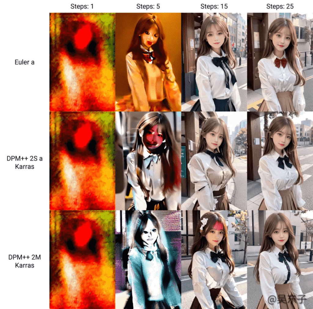 我们就可以看到在不同的采用方法下,迭代步数为25的时候,生成出来的照片都差不多