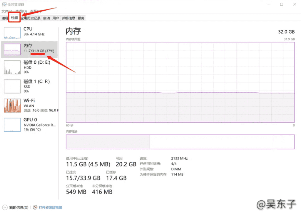 在“性能”里面找到“内存”,这里的内存不是电脑的存储内存,而是运行内存噢!