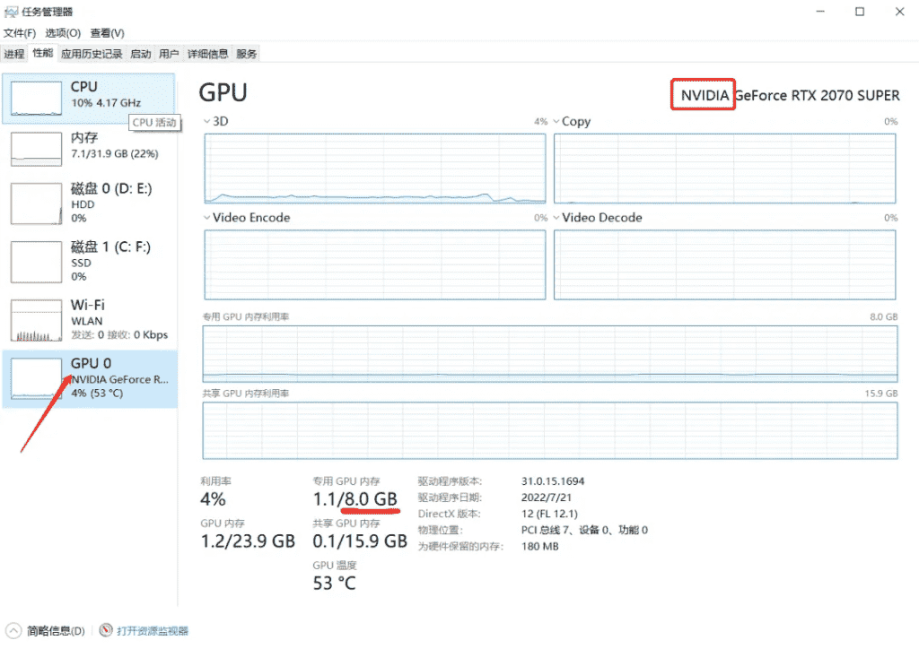 必须确认的第一个是 NVIDIA ,代表的是英伟达的显卡(俗称N卡),这里是N卡我们才可以进行下一步,