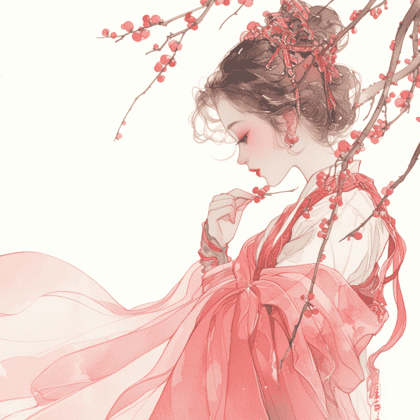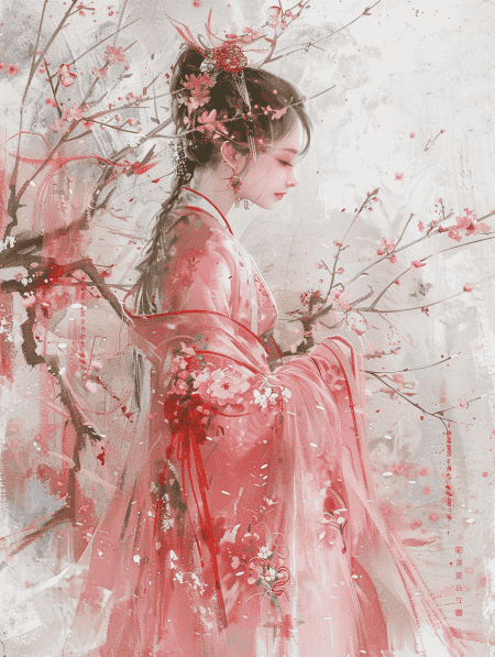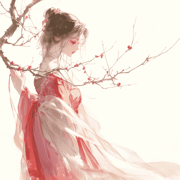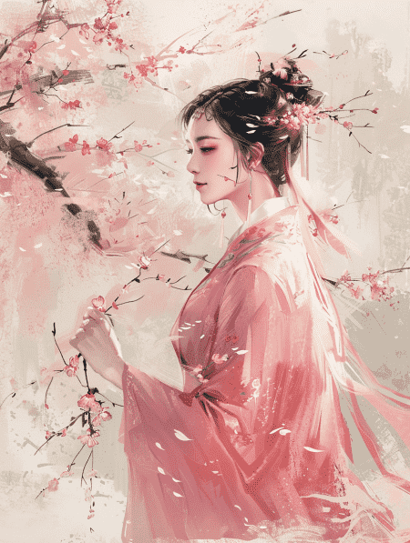 in style of Kawacy, Girl in ancient Chinese costume, wearing pink traditional dress, holding plum branches, delicate face, side view, full-body shooting fantasy art, minimalism, fine lines, color gradient ultra-high detail, simple and elegant atmosphere, high resolution –v 6.0
