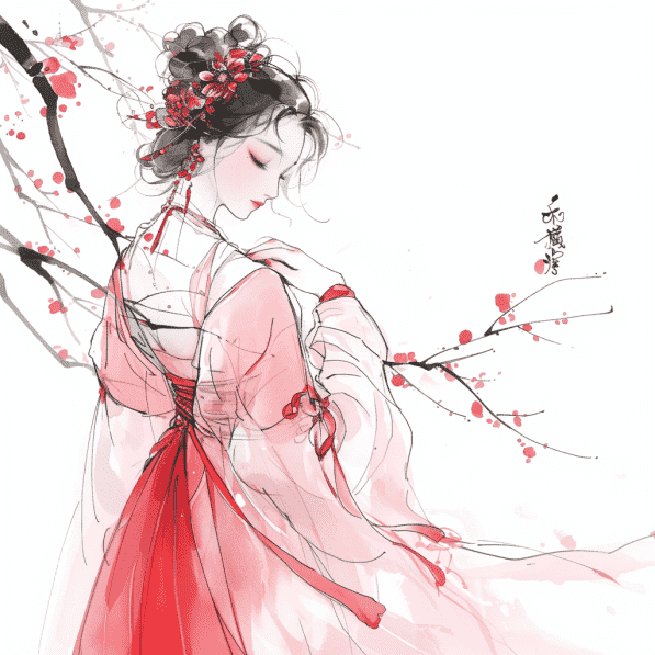 Girl in ancient Chinese costume, wearing pink traditional dress, holding plum branches, delicate face, side view, white background, pastel painting, minimalism, full-body shooting, fantasy art, ink painting, fine lines, color gradient, ultra-high detail on white background, simple and elegant atmosphere, high resolution –niji 6