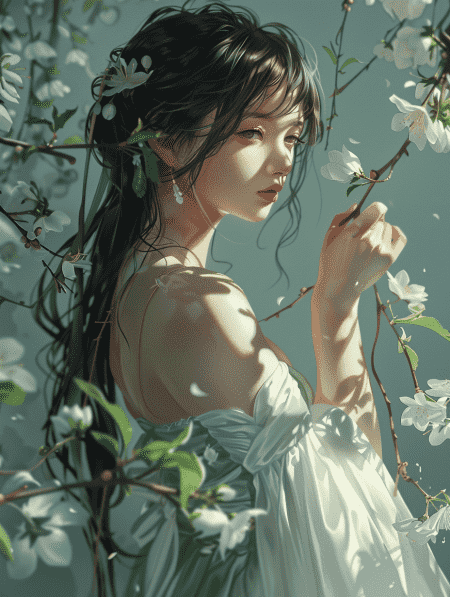 in style of Kawacy, Girl in white green dress, holding plum branches, delicate face, face to viewer, full-body shooting fantasy art, minimalism, fine lines, color gradient ultra-high detail, simple and elegant atmosphere, high resolution –v 6.0 –ar 3:4