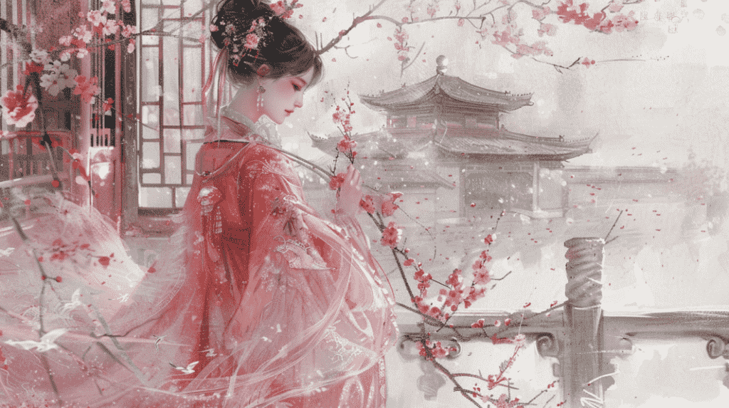 in style of Kawacy, Girl in ancient Chinese costume, wearing pink traditional dress, holding plum branches, delicate face, in Forbidden City, side view, full-body shooting fantasy art, fine lines, color gradient ultra-high detail, simple and elegant atmosphere, high resolution –v 6.0 –ar 3:4
