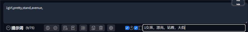 SD只能识别英语,这时候刚刚说的插件就派上用场啦,我们把提示词粘贴进去,就可以直接生成英文了如下图: