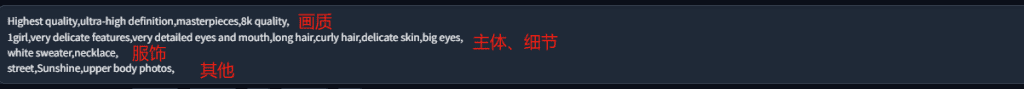 画质+主体+主体细节+人物服装+其他(背景、天气、构图等)