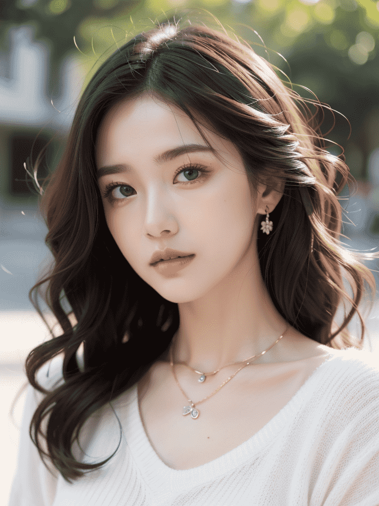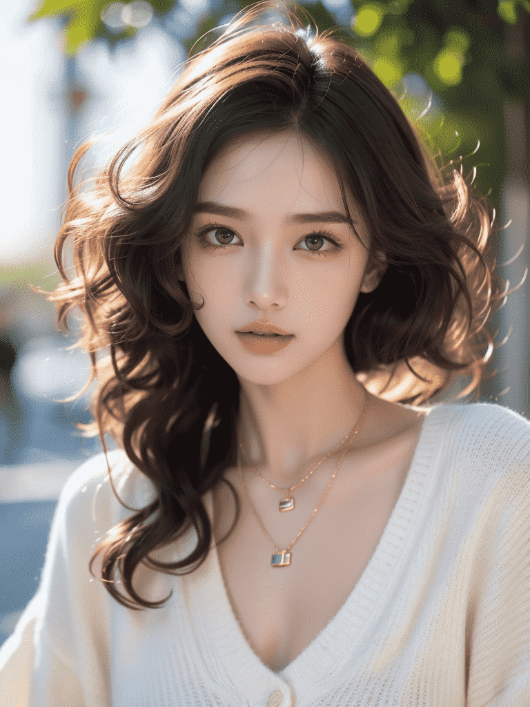 也就是:一个女孩,非常精致的五官,极具细节的眼睛和嘴巴,长发,卷发,细腻的皮肤,大眼睛